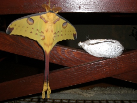 Nui, who works at the Butterfly Farm in Stratford, brought us a present of a chrysalis. There it is on the right, that silver pod. And next to it you can see what came out of it. We haven’t given it a name and we don’t know if it’s a he or a she, nor do I know the species but I’ll find out. If we want to give it a name we’ll have to hurry as it won’t long be with us, it can only live for a few days. How about this for a rebirth, it has no mouth!