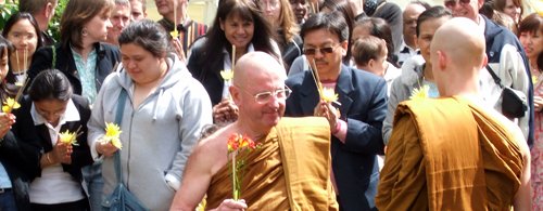 So, last Sunday we held our celebration of the Birth, Enlightenment and Parinibbana of the Buddha. We had a good crowd, plenty of good food, and after the almsround and we’d all eaten we circumambulated one of the Buddha Rupas in the garden. In the picture we’re just setting off after I’ve finished trying to persuade everyone to be meditative, mindful and to please not get lost.
