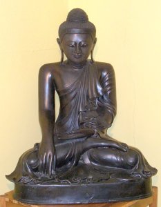 Many years ago, before I went to Thailand and while I was still an actor, I set up the Lay Buddhist Association for Wat Buddhapadipa which was then located at East Sheen on the outskirts of London. While I was drafting the constitution I sought some advice from a Buddhist solicitor who was recommended to me. His name was George Goulstone and he had a rather eccentrically arranged office in Lincolns Inn, at least I think that’s where it was, at any rate somewhere around there. He received me affably enough and gave me some helpful advice. Later when I returned from Thailand with Ajahn Chah and set to trying to revive the Hampstead Vihara I discovered that George had been a Director of the English Sangha Trust. He still lived up the road from the Vihara and I or someone made contact to see if he was interested in helping again but he wasn’t. In any case by the time I had met him all those years earlier he had already moved towards Tibetan Buddhism and was quite close to Chime Rimpoche who I knew well. The next time I heard of George was about ten or more years ago when Stanley de Freitas told me of this elderly Buddhist lawyer who had retired to a nearby village and who was not in the best of shape. George had retired to Goring on Thames with his partner Christine Kemp and I believe he had had to have both legs amputated. When he died a year or two later, one of his prize possessions, an old and very fine image of Amitabha standing, was sent over to us by Christine who I’d never met. I subsequently corresponded with her briefly and put her on our mailing list. Then in August this year I had a letter from a solicitor to say that Christine Kemp had been killed in an accident and in her will had left The Forest Hermitage a three foot high Buddha Rupa and some framed Bodhi leaves. She had been killed very tragically as she was walking just down the road from where she lived when the doors of a passing van flew open and hit her. She was killed instantly. I was able to call and collect the framed Bodhi leaves earlier this month on my way back from Broadmoor but the Burmese Buddha Rupa had to wait to be removed professionally and brought here. It finally arrived last Monday and we’ve installed it in the room in which we eat.