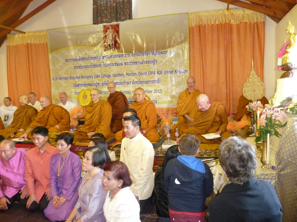 A Kathina is the ceremony that may take place where suitable conditions are in place during the month that follows the Vassa and involves the presentation of robe cloth or a robe to the Sangha that then offers the robe sewn from the cloth or the robe to one deserving monk. A Royal Kathina is when the robe is offered by a monarch. This year in England a Royal Kathina was offered by His Majesty the King of Thailand in Devon on Sunday, November 18th and another a week later at Amaravati. During each ceremony a blessing is recited for the King and that is supposed to be done by a monk with the rank and title of a Chao Khun, which is why I was invited to both occasions. I had never before been to Hartridge Monastery, often referred to as the Devon Vihara, and so after the ceremony which was held in a local village hall I was pleased to spend an enjoyable hour there as well. Both occasions were well attended and raised impressive amounts of money, at Hartridge for the extension they are planning to build there, and at Amaravati to help meet the huge expense of running such a large and popular temple. I was well received at both and thoroughly enjoyed both occasions, and I was pleased to be of some service.