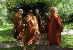 So, last Sunday we held our celebration of the Birth, Enlightenment and Parinibbana of the Buddha. We had a good crowd, plenty of good food, and after the almsround and we’d all eaten we circumambulated one of the Buddha Rupas in the garden. In the picture we’re just setting off after I’ve finished trying to persuade everyone to be meditative, mindful and to please not get lost.