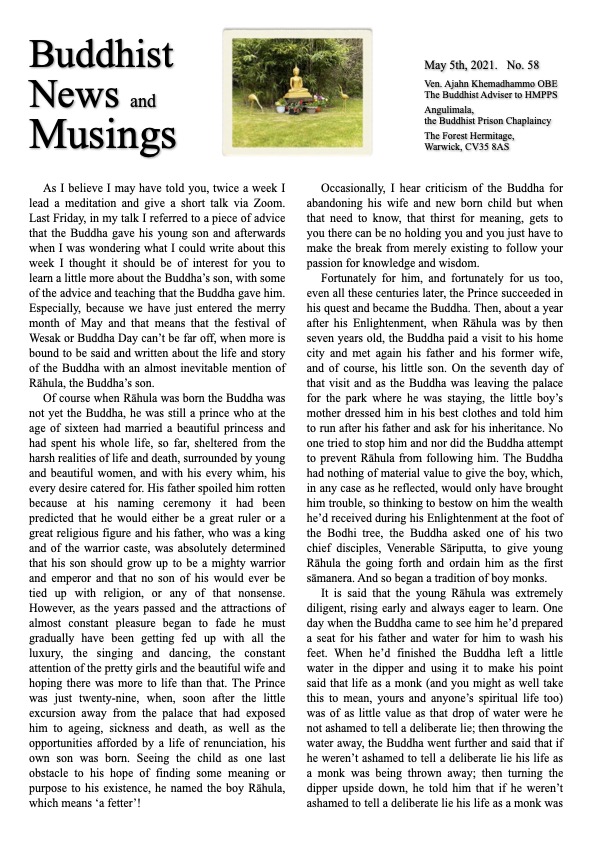 When the lockdown began I was asked to give a weekly talk for National Prison Radio. I decided to adapt the text of my talk for a weekly newsletter for Buddhist prisoners. This was my talk on April 29th with a pdf of it in the April 29th newsletter here.